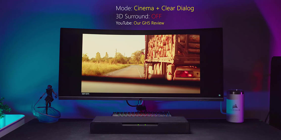 Now we will jump into some games and I will talk the soundbar and all of its game modes. Another thing to mention is Dolby Atmos support on the soundbar is present, but the list of games that support Dolby Atmos is still fairly limited. Dolby Atmos is another form of simulating surround sound with that whole balancing of audio, giving you rear channels, giving you good height and vertical audio, and in certain games that works well while in others not so much. When it comes to this Panasonic Soundslayer I prefer 3D surround to be always on, I find the soundstage expansion is not too aggressive, it’s just natural and it’s nice. With it off it sounds like it is a stereo speaker in front of you but without the width that I would expect. I also prefer to enable the Clear Dialogue option, which can be enabled independently of other settings, which is nice. It just boosts the high-end slightly, so in bass heavy situations that might drown out the vocals in games, Clear Dialogue helps to boost those treble frequencies so you have a better and more balanced audio representation. This is especially true when you are sitting really close to the soundbar like in this PC setting, if you are slightly further back I find the bass does bounce out around the room slightly more so the Clear Dialogue option is not as necessary.