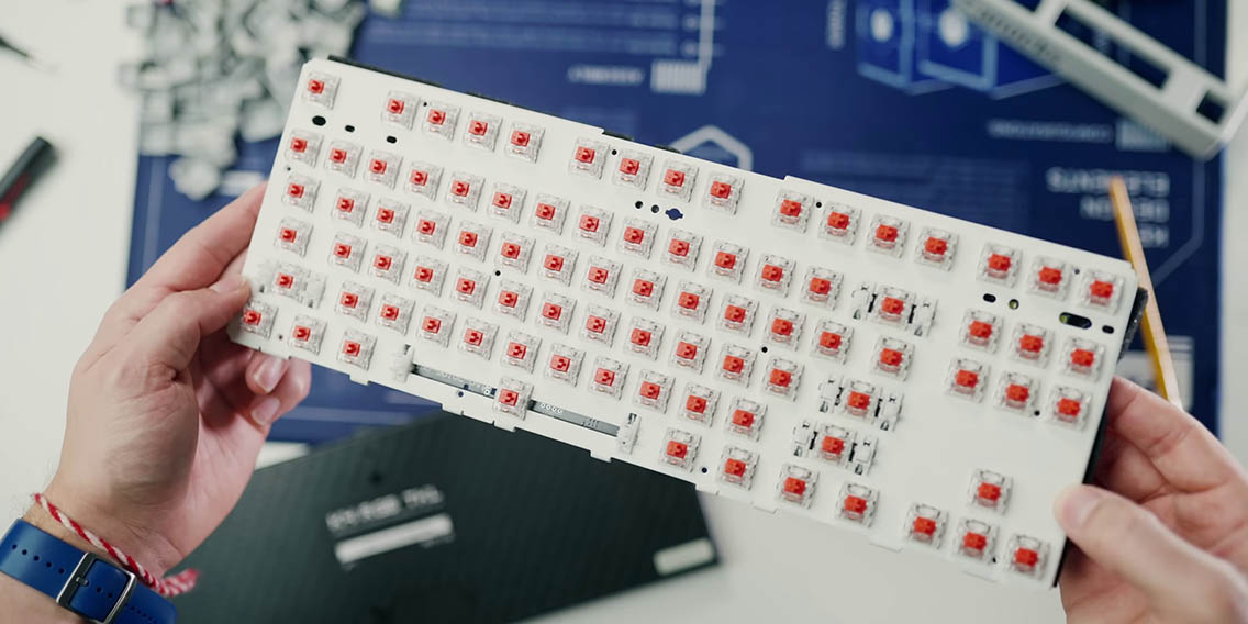 The next step is removing my top plate, something that is possible on this particular keyboard, your keyboard might not have this or might not have the top plate altogether with the floating style keycaps, which would make the next process much easier. With my keywords in particular having no top plate gives me better access to the very edges of the keyboard for better cleaning. This allows me to clean this portion separately and also will make it much, much easier to actually remove the keycaps. Now before removing the keycaps you can take a photo of it so you can reassemble the keycaps back in place easier. You can also find this product online, open it up on your monitor, and have a much larger image of where each keycap goes which is what I’m going to do.