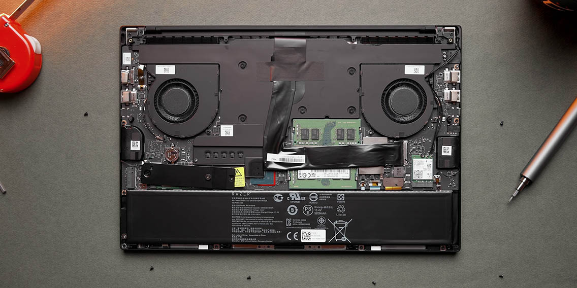 Upgradability is pretty flexible on the new Blade 15. Once you get under the hood and you have quick access to two RAM modules. The primary NVME SSD is actually hidden underneath a bracket and the drive speeds are really fast. Now you might be wondering about this bracket and its purpose, well Razer has actually managed to add an additional M.2 slot for storage expansion. They have designed this in such a way that you can simply add the second NVMe SSD on top and secure it with the pre-installed screw. It’s basically a layered set up, which is pretty cool.