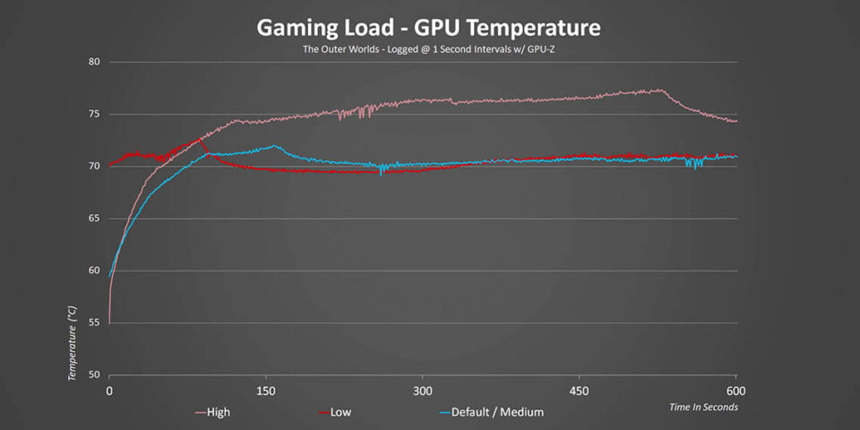 Frequencies were super stable too, with Low and Medium hitting an average of 1350MHz, while high capped at about a 100MHz higher than that. It’s weird that the power spikes in the high power mode didn’t really affect clock speeds, but my theory of game asset loading could explain this as well. One of my biggest concerns over previous generations of Blade 15 laptops was always temperatures, but it seems like Razer does have things under control… at least in gaming. Even though this laptop has its GPU set higher than a lot of the others that I have come across it actually never made it to 80°C.
