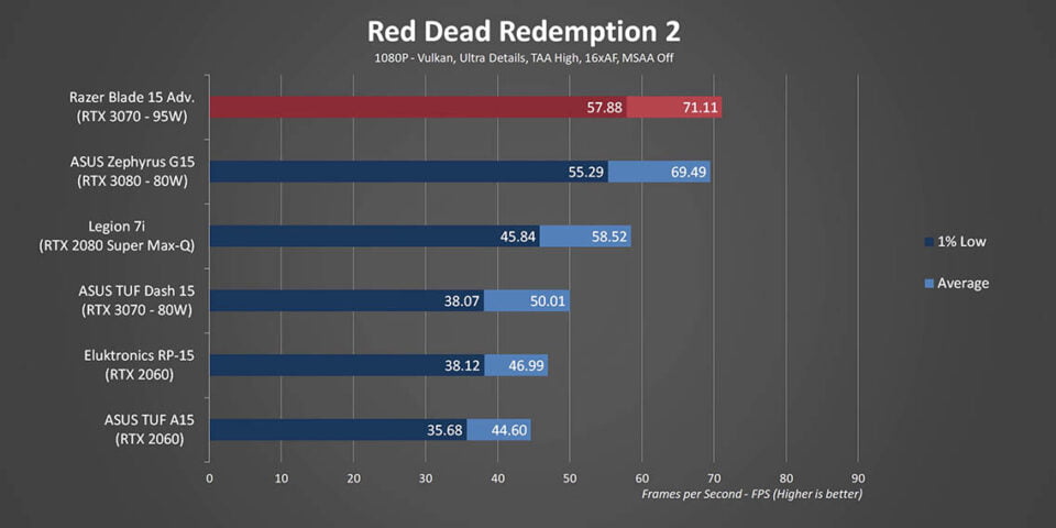So what do you get when you combine an RTX 3070 operating in 95W in the highest setting with an Intel Core i7-10857H? Well it’s one of the fastest gaming laptops that I have come across so far. It overcame the ROG Zephyrus G15 and that thing had an RTX 3080. That goes to show that the name of the GPU isn’t everything, give a mobile RTX 3070 enough power and it can match or beat a lower wattage RTX 3080. Just remember this though, the G15 is also a good $500 cheaper… provided you can actually find one of those rare laptops. Even at 1440P the Blade 15 advanced powers ahead in most cases, which should really get you thinking about which model you end up buying from any laptop these days.