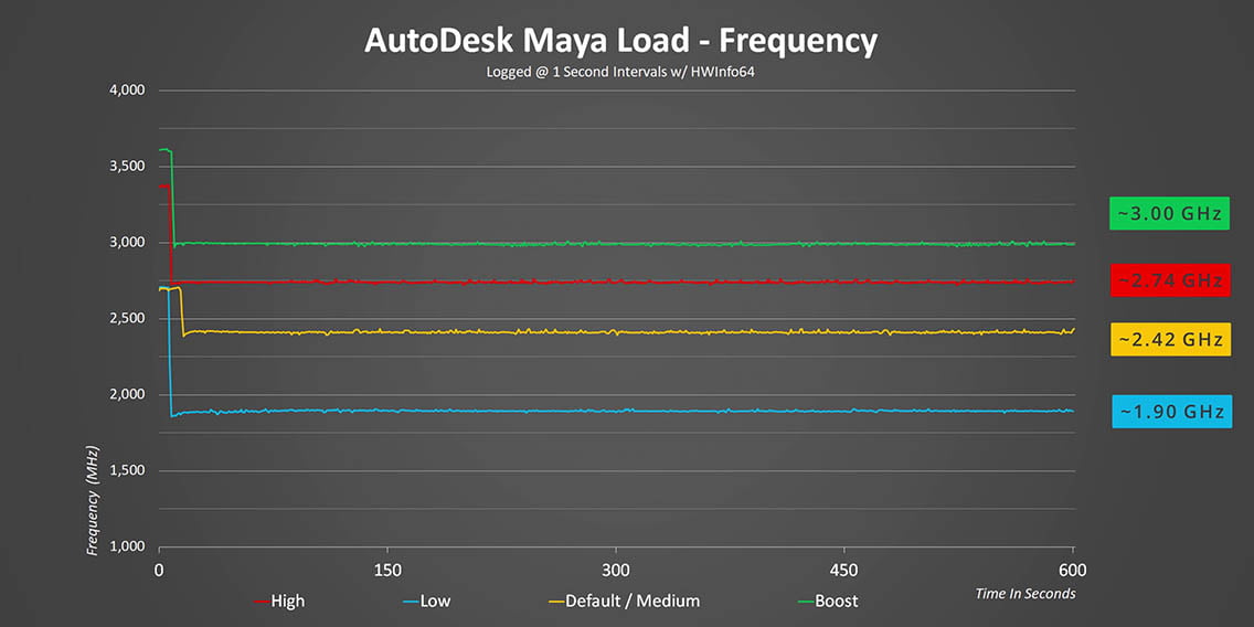 Now that we have established that this thing is a super impressive choice for gaming, what about real-world usage? Well let’s dive into that and see how the processor behaves in Razer’s various modes. Starting with power over time, and this is something we love seeing. Every single mode brings something different to the table. Low hits a constant 25W, Medium/Balanced is 35W, High is 45W, and finally Boost nails that claimed 55W mark without any problem, so expect pretty different performance results from each of them.