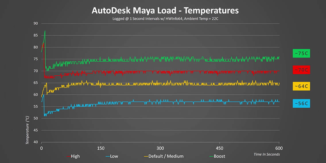 The frequency curves follow the power readouts perfectly. Would I use the Low setting for creative tasks? Absolutely not since it tops out under 2GHz, but it does give the lowest surface temperatures and noise so it’s perfect for light loads like web browsing and general office work. Then there is some serious jumps to 2.4GHz in Balanced mode or 2.75GHz in High, and then finally about 3GHz in that Boost setting. Taking look at temperatures, they are once again super well managed across every single setting. It feels like Razer’s engineers spent a ton of time refining their design, fan curves, and power limits so they could get the Blade 15 to behave so differently depending on which setting you choose.