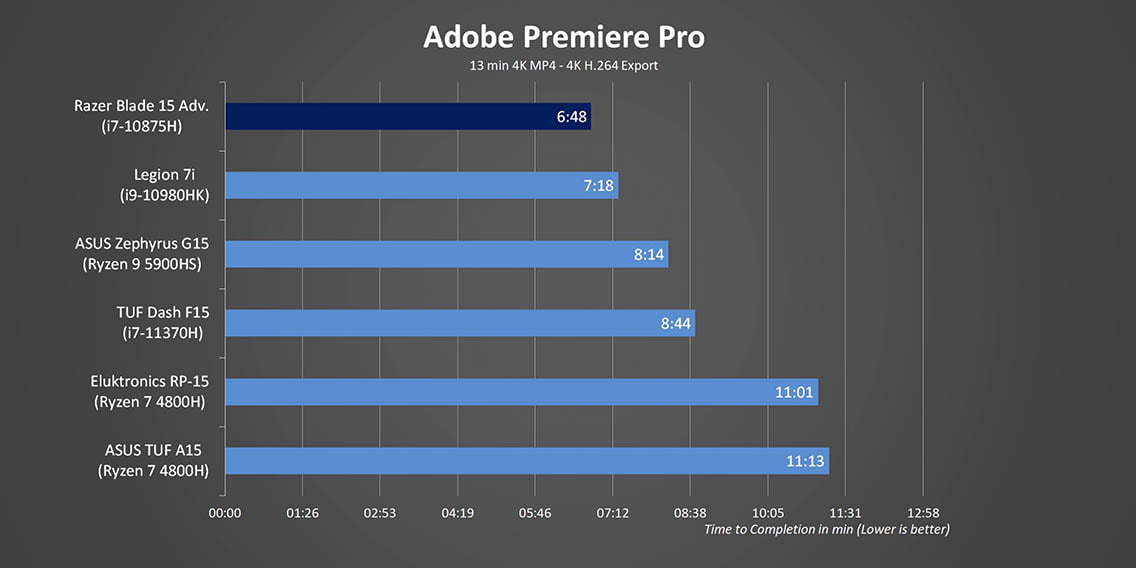 And now let’s take a look at some real-world benchmarks, and right away you can see the challenge that Intel’s partners face when using 10th gen Comet Lake chips in their laptops. While single thread performance is competitive, there is just no way the CPU’s can match what AMD is bringing to the table. And remember the Blade 15 Advanced costs more than any of the Ryzen-based laptop in these charts. The i7-10857H just gets steamrolled again and again and again, and again. The only real thing saving the situation is performance in creative apps that are GPU accelerated, like Adobe Premiere and DaVinci Resolved. Here the RTX 3070 and a very good lightly threaded output from the processor combine to make a really interesting solution, but that’s actually a pretty typical result for Intel laptops these days. AMD is catching up though.