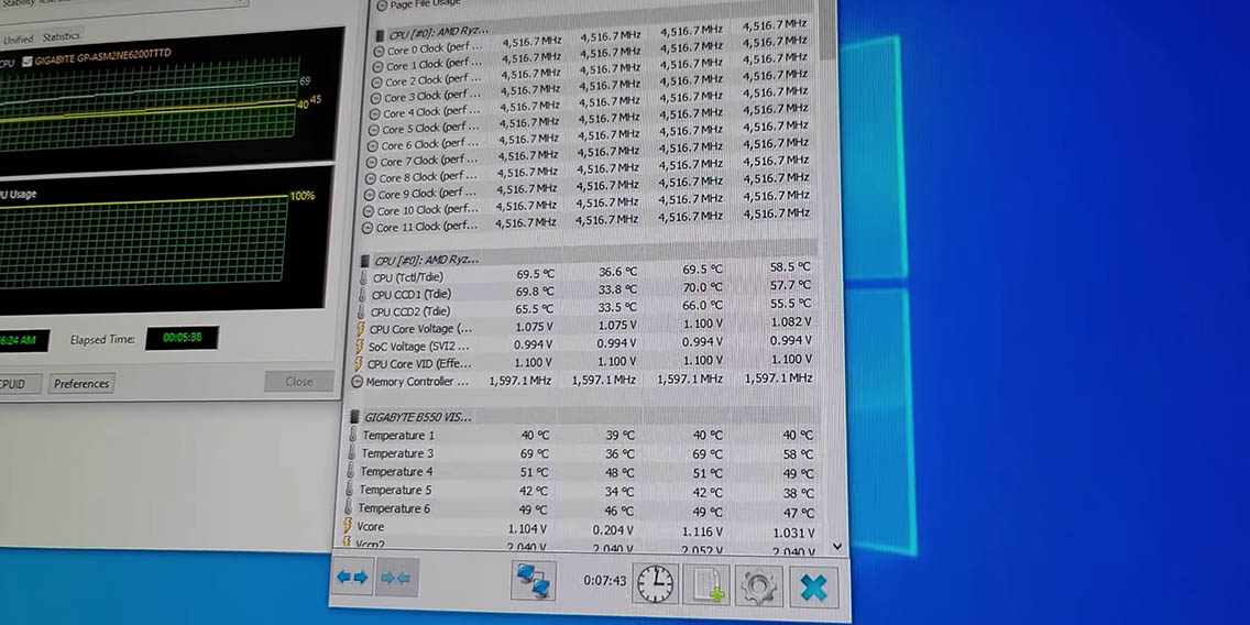 Mike: Next I wanted to talk a little bit about the Ryzen 5900X, because it is a brand new processor on an existing platform. We are working right now with beta BIOSes but as you are reading this the public BIOSes are probably available, and there might even be a couple of revisions between now and then. The B550 Vision D is an amazing motherboard and its BIOS is definitely unique, it’s white like the motherboard itself, but right now it does tend to overvolt the processor at least with the Core Performance Boost on, which leads to a little bit more heat output than our cooler could handle. I needed to go in there and modify a couple of settings – we are not using Eco Mode this time – and it’s still running between 4.5GHz and 4.7GHz on an all-core load. The temperature is staying under 70°C, and that is with only the one fan running, so the cooler is doing a good job. However, Eber did have some issues with this cooler.