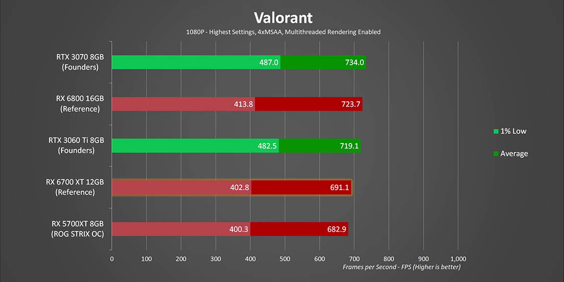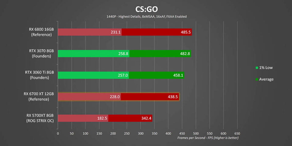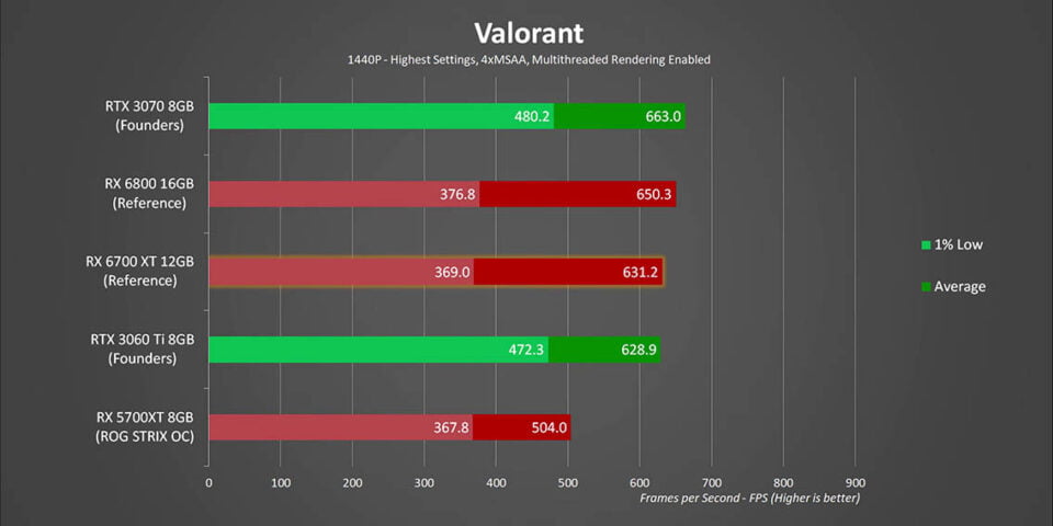 Let’s start with 1080P, and here the RX 6700 XT really isn’t anything special, but that is likely due to the fact that some games like CS:GO and Valorant tend to be CPU limited, which artificially caps frame rates. Even then, this card trades blows with the RTX 3060 Ti rather than the RTX 3070. What you can expect is a good bump over the RX 5700 XT. Now that leads to it having a pretty poor overall value. If your gaming at 1080P, though it doesn’t fare better than the RX 6800. Then again, all of this is only valid if you can actually find one for $480 USD.