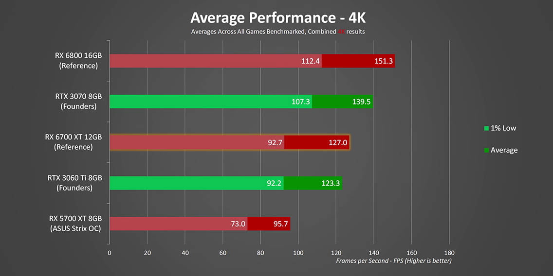It turns out that increasing the resolution can make the 6700 XT look a lot better, especially when it comes to the 1% lows, which are now better than the RTX 3060 Ti. However, it’s the lack of consistency that keeps coming up. I mean sometimes the XT beats RTX 3070 cleanly and then in the next game it gets owned by the RTX 3060 Ti. Based on overall results I wouldn’t buy anything under a RTX 6800 or RTX 3070 for 4K gaming. The RX 6700 XT does deliver an okay value here, but it just struggles to justify its overall cost at any resolution though.