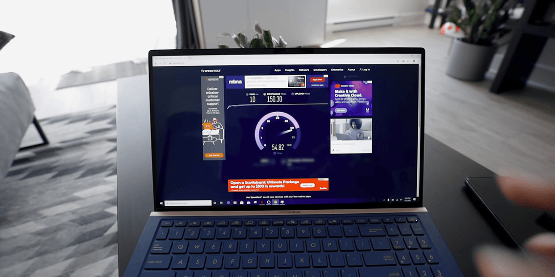 Now comes the moment of truth. I’m going to re-run all of those tests on the Zenbook 15 with this new router and see if there is an improvement. Keep in mind that that laptop does feature a Wi-Fi 6 network card, so it will be interesting to see how we can leverage Wi-Fi 6. Okay, so I loaded up Speedtest.net, clicked on GO, and the improvement was shocking. I literally just want to go outside and cry, because I was exactly what I paid the internet connection speed I pay for, which is 450Mbps download and 50Mbps upload. Next I did the Netflix episodes download and this was even more exciting. The total time was 1 minute and 17 seconds compared to 3 minutes and 20 seconds earlier. That is definitely a noticeable improvement that you would feel day-to-day. Then it was time to hop into Skype, and make said that the video and audio quality were perfectly fine. The million dollar question is how will the performance be when I head back outside.