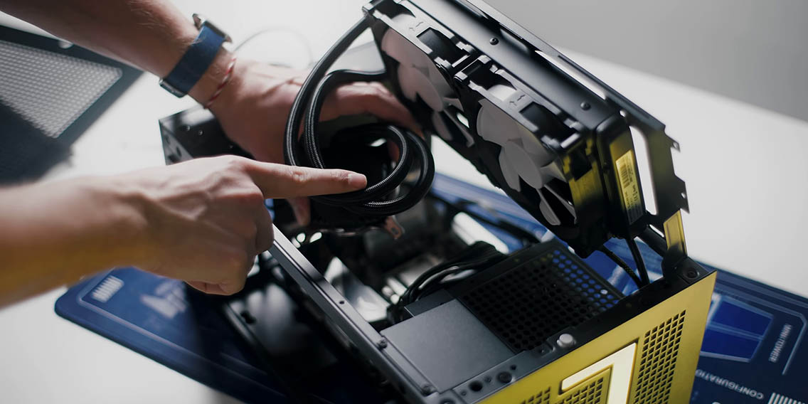 As for the assembly, can I just say how nice it is to have all your ITX linked cables already pre-installed. I guess that is one of the major advantages of having a power supply already included in the enclosure. Some SFX power supplies still have those massive long cables, while here everything is that ITX length. There is no extra length you have to slide somewhere and find room for, everything is precut to your ITX system. But I really do not like working with this style of cable, which are that low-profile really stiff cables that are really difficult to come compress and like stash away in places because of that already dense cable. Beside that the only other hurdle was the pump installation, because you need to rotate the pump to twirl the tubes so they don’t hit the fans.