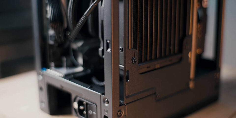 As for storage, we have two 2.5-inch SSDs behind the GPU, with this large cutout in the middle for your SATA cables, and a 3.5-inch mechanical drive slot beside the power supply. This space is actually really useful for storing your cables instead of the hard drive, but the option is there if you need it. And here is the full spec rundown, it’s a quite impressive for a case under 20L, but also nothing out of the ordinary. This is the type of a compatibility we have come to expect from cases this size, and it’s just a matter of how is the user experience? And what’s the cooling like? That is what really separates one case from another.