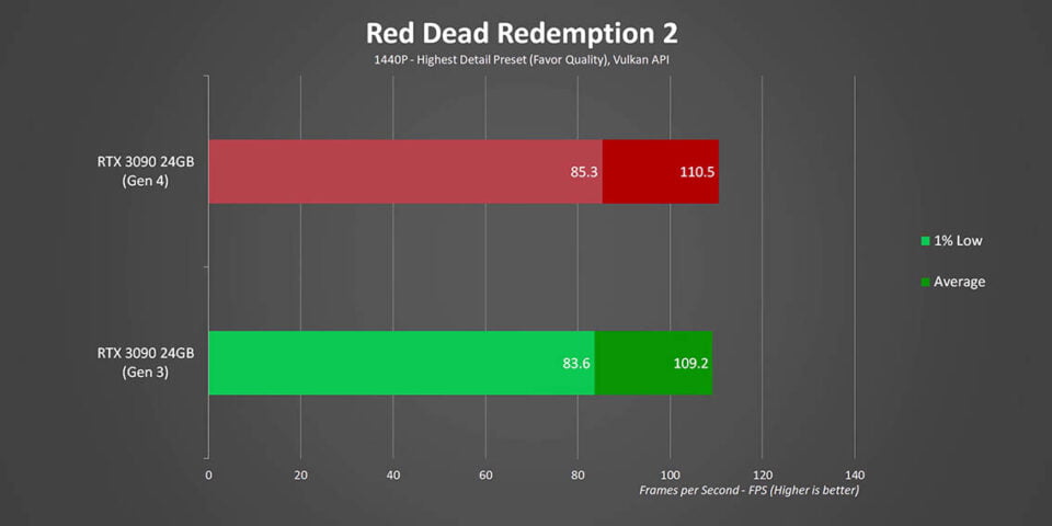 Next let’s talk about performance because obviously we are lowering the bandwidth of our PCIe slot, and when we run the bandwidth test with 3DMark bandwidth is indeed slashed from 26 GB/s versus 13 GB/s. But what about in gaming? Let’s take a look at the RTX 3090, the most powerful GPU around right now, and if anything is going to show an impact it would be this. Overall, there are some very, very small performance trade-offs, but nothing you would notice with the naked eye. It is interesting to see that it looks like games with Ray Tracing enabled might benefit more from Gen4, and that is something I think we need to look at a bit more in a future article. Either way, there is nothing really concerning or worrying here.