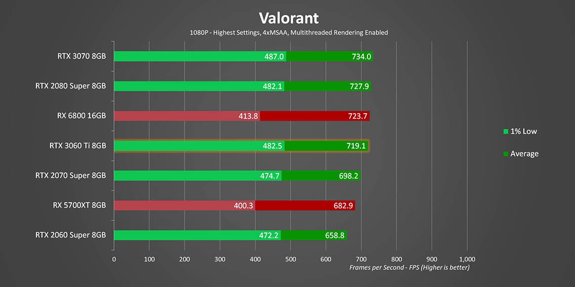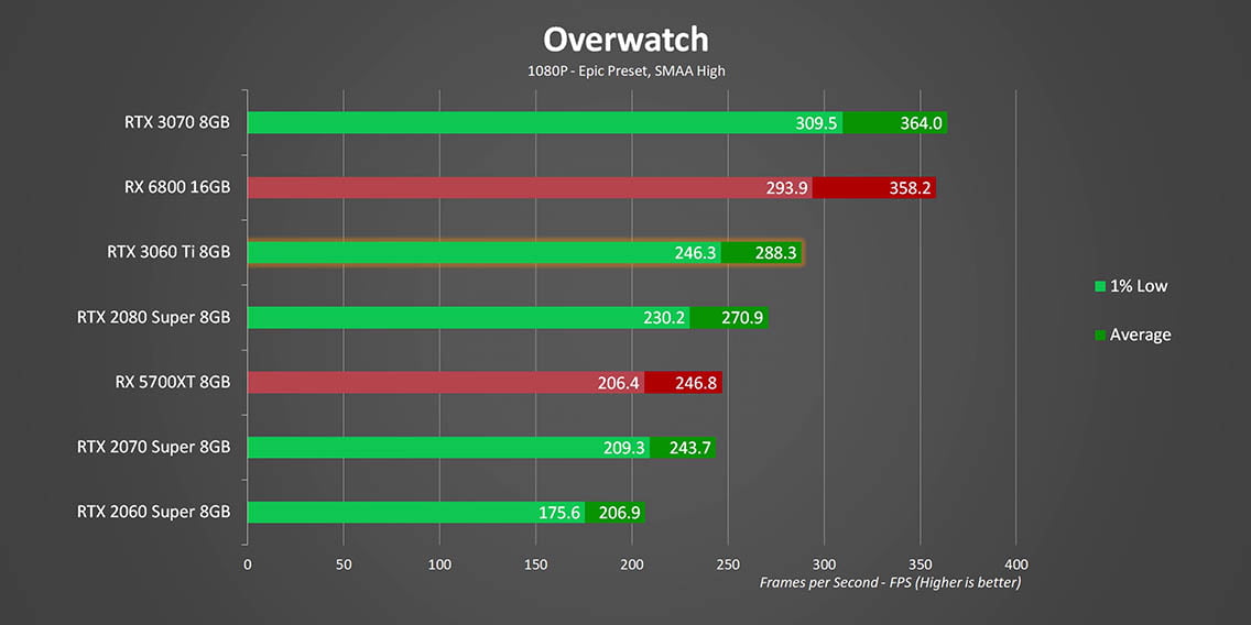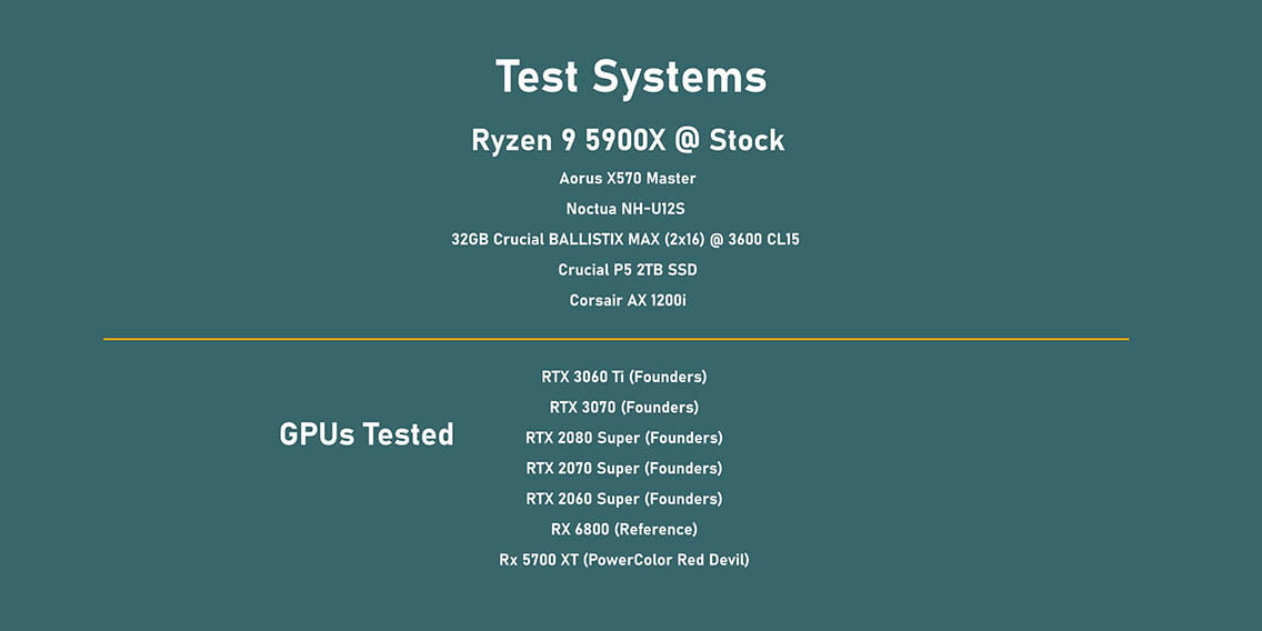 Before we get into the benchmarks let’s talk about the test system, and nothing really has changed from the RX 6800 review, but we are adding a bunch of other GPUs so everyone can get a better idea about where the RTX 3060 Ti lands right now. At 1080P this card’s performance is right in line with what NVIDIA said it would be. It cleanly beats the RTX 2080 Super in situations that aren’t CPU limited, and in all of our results it is behind in just one. Against the RTX 2060 Super… well it isn’t even close with the RTX 3060 Ti usually hitting between 25% and 45% higher frame rates. I mean, sure, there are some games that are bottlenecked even by our Ryzen 9 5900X, but overall this is pretty impressive. On average the RTX 3060 Ti is an absolutely winner against the RTX 2080 Super.