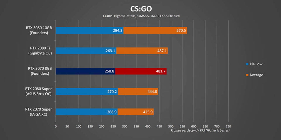 Now let’s cut to 1440P testing, and this resolution really seems like the sweet spot for the RTX 3070. Both the 1% lows and average frame rate leads get extended against the RTX 2080 Super and RTX 2070 Super, even though both of those cards are slightly overclocked by board partners here. It is basically a clone of the RTX 2080 Ti’s performance. At the same time, the RTX 3080 stays way ahead by about 25% since it’s lead is getting even bigger with the CPU bottleneck being removed in some games.