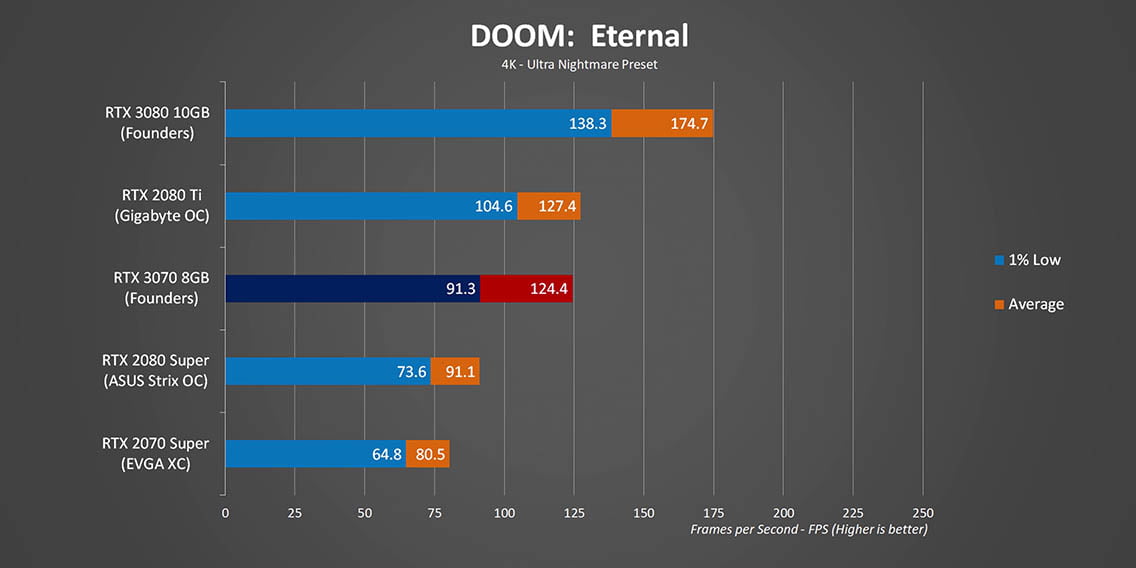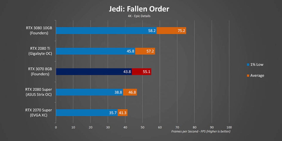 Well that pretty much wraps up this part of our coverage, and I have to say that the RTX 3070 delivers better performance at less power compared to the RTX 2080 Super. Now I wouldn’t go out and buy a 3070 if I already had an RTX 2000 Super series GPU, and that is because this doesn’t give you a substantial performance uplift like the RTX 3080 did relative to its price. For example, the RTX 3080 is about 45% faster than the RTX 2080 Super despite launching for the same $700 USD price point. On the other hand, the RTX 3070 gives you roughly 25% higher frame rates than RTX 2070 Super, and both those cards cost around $500 USD. Now it might be that adding ray tracing could change the equation, but that is something that we will have to test out in a separate article. Speaking of the RTX 3080, it’s pretty obvious that NVIDIA left a massive performance hole between it and the RTX 3070 so they could fit another GPU into that lineup. However, I also have to wonder if that hole will give AMD opportunity that they need for the RX6000. I guess that is something that we will find out soon.
