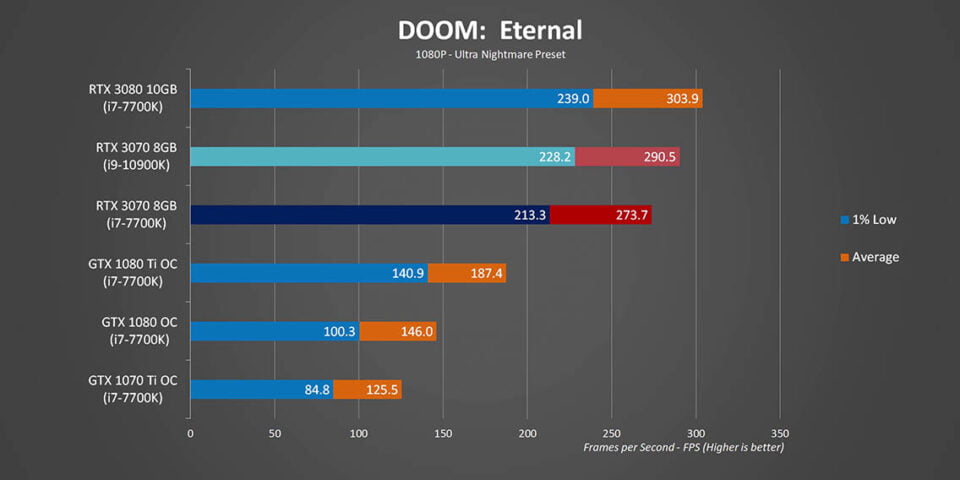 Another issue at 1080P is much higher 1% lows on a system equipped with a more modern CPU like the 10900K. Overall there can be huge benefits when upgrading from a GTX 1080 or GTX 1070 Ti even at this resolution, yet at the same time there is also a very real situation of diminishing returns in some games. On the other hand, I wouldn’t buy an RTX 3080 to play at 1080P on a 3-year-old system. You are much better off saving some money for a whole system upgrade.