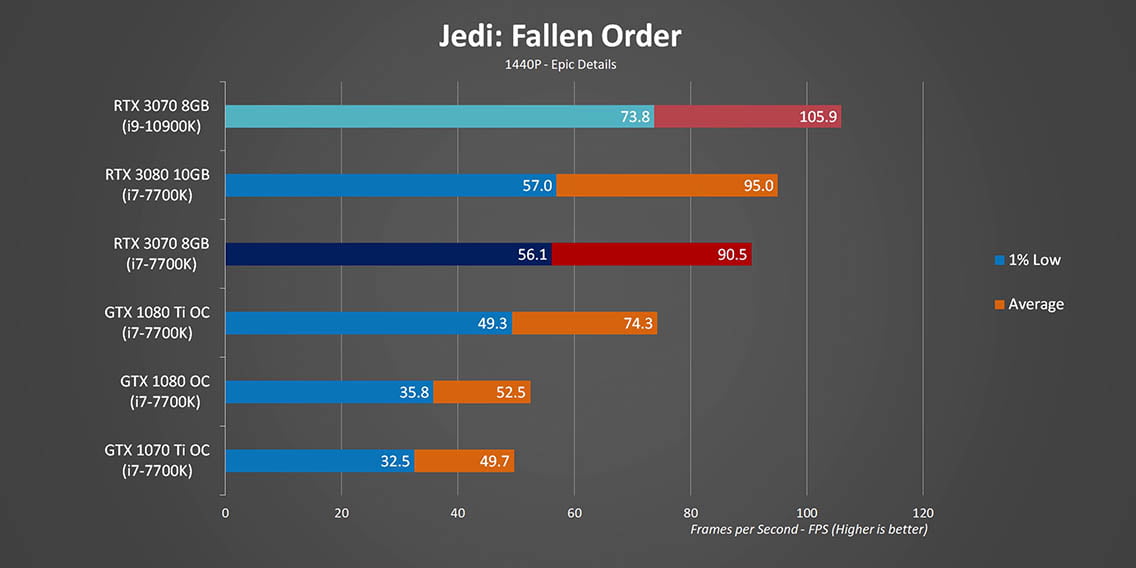 Moving on to 1440P and it’s a very different story. Sure, there is still a bit of bottlenecking, but the more powerful cards are now starting to stretch their legs. As a matter of fact, the delta between the 10700K and 7700K systems virtually non-existent in most situations. We already saw this in our RTX 3080 review, and it’s the same here. Unlike the 1080P results at 1440P you could pop one of those GPUs into your system and be confident that it will provide an amazing overall gaming experience compared to what you currently have. Add a new SSD into that equation for your game drive and you will have a snappy system that will almost feel like new. It’s really amazing to see how GPU bound games are these days, but that is understandable because CPU performance has been moving at a slow pace so developers have looked towards graphics processors to execute more in-game tasks other than just rendering.