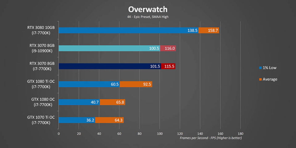 What I said about 1440P is doubled down at 4K. The RTX 3070 just walks all over older GPU’s, offering double or sometimes even close to triple the frame rates. While I’m not sure how many of you are going to pair up an expensive 4K screen with a 3-year-old system, at least you now know there is an option for an incremental system upgrade rather than just buying a whole new setup. Something else jumps out with these results though, at 4K the GTX 1080 Ti is able to hang right in there in some games. It isn’t super competitive in every situation, but it just goes to show NVIDIA’s flagship from 2017 does still have some fight left in it.