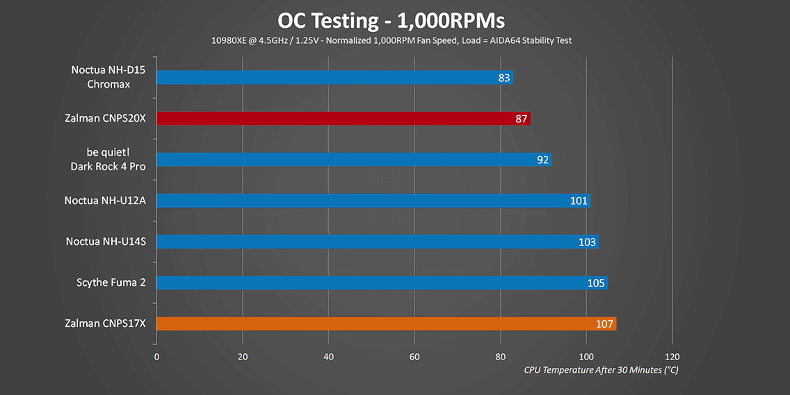 Now before I get into the overclocking results, I do want to quickly sum up the stock CPU results because Zalman’s performance on our Core i9-10980XE can be used as a great representation of how the CNPS17X and the CNPS20X would stack up on lower wattage processors. For example, I’m sure that the results would be very similar to these on a Ryzen 9 3950X or a Core i9-9900K. However, overclocking the Core i9-10980XE separates the men from the boys. I should also mention that this pushes thermals above what the smaller CNPS17X is rated for.